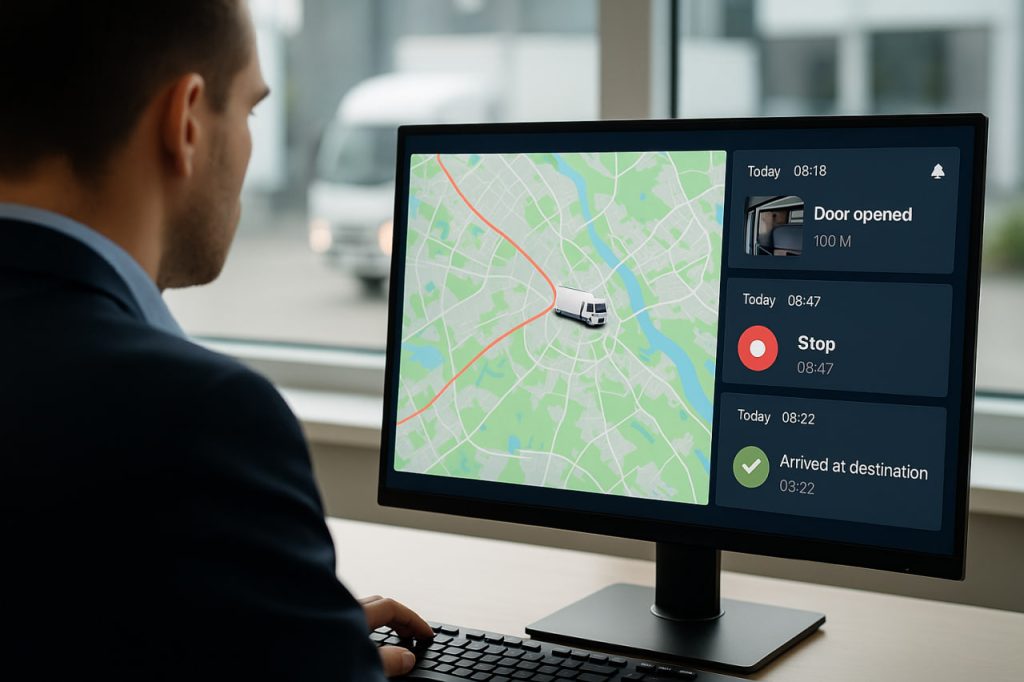 Руководитель или диспетчер может в реальном времени наблюдать за маршрутами и получать фото-/видеоснимки при событиях (прибытие, остановка, открытие двери и т. д.).